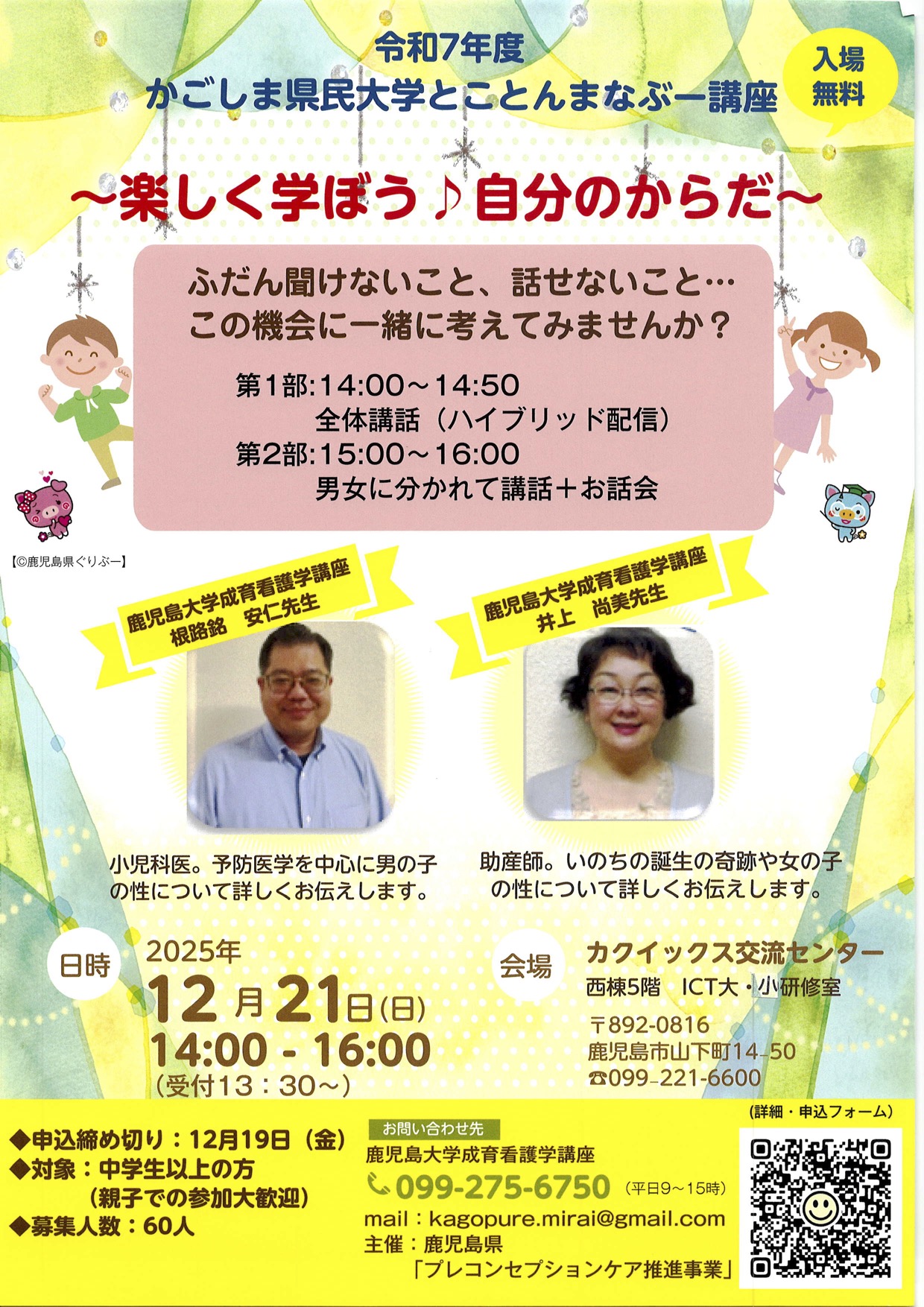 令和7年12月21日(日)に「かごしま県民大学とことんまなぶー講座 ~楽しく学ぼう♪自分のからだ~」を開催します。普段なかなか聞けないこと、話せないこと…一緒にお話しながら考えてみませんか?たくさんの方のご参加を心よりお待ちしております。(詳細はチラシをご参照ください)